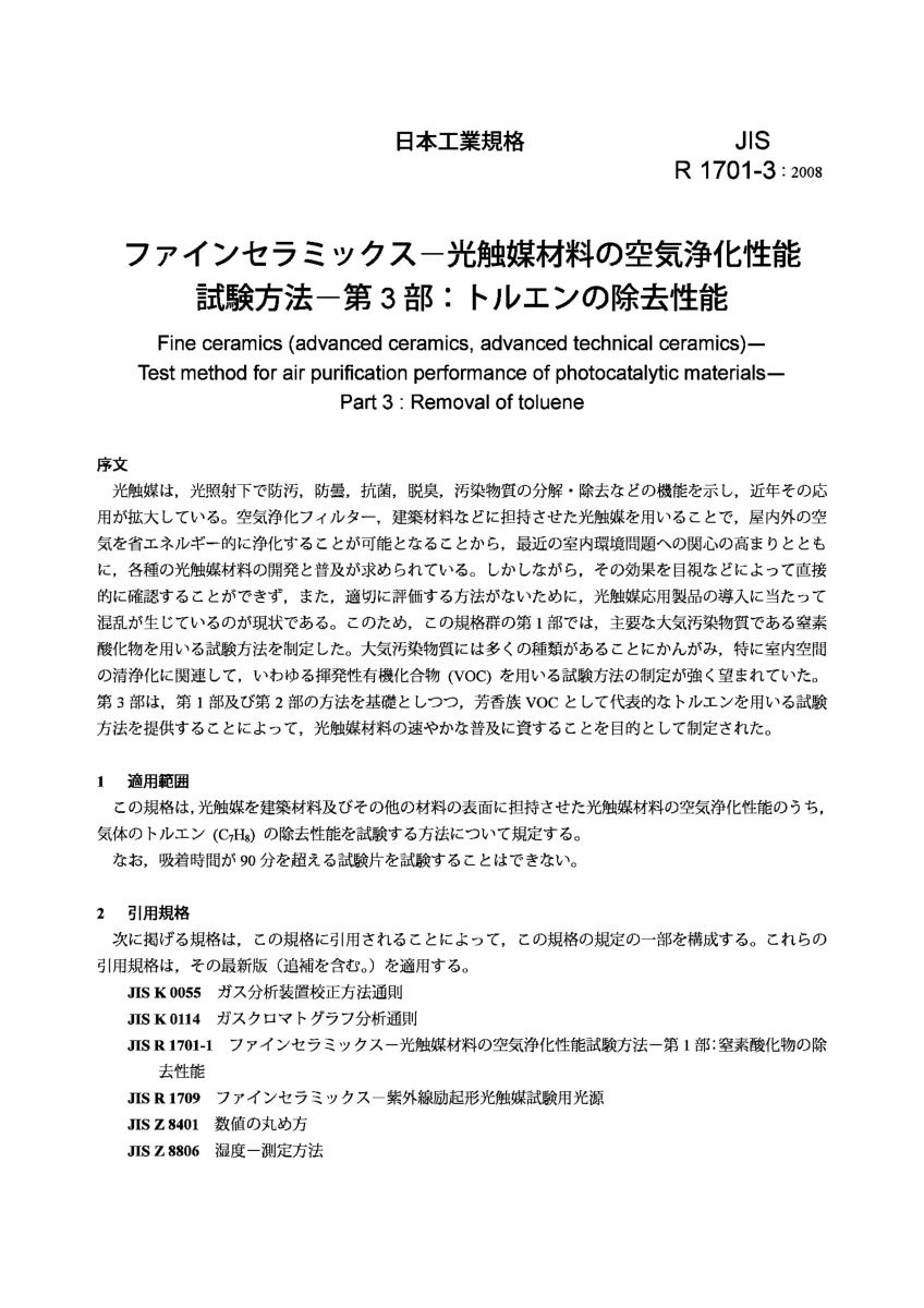 JIS R 1701-3-2008 精细陶瓷(高级陶瓷、高级工业陶瓷).光催化材料的空气净化性能的试验方法.第3部分甲苯的脱除