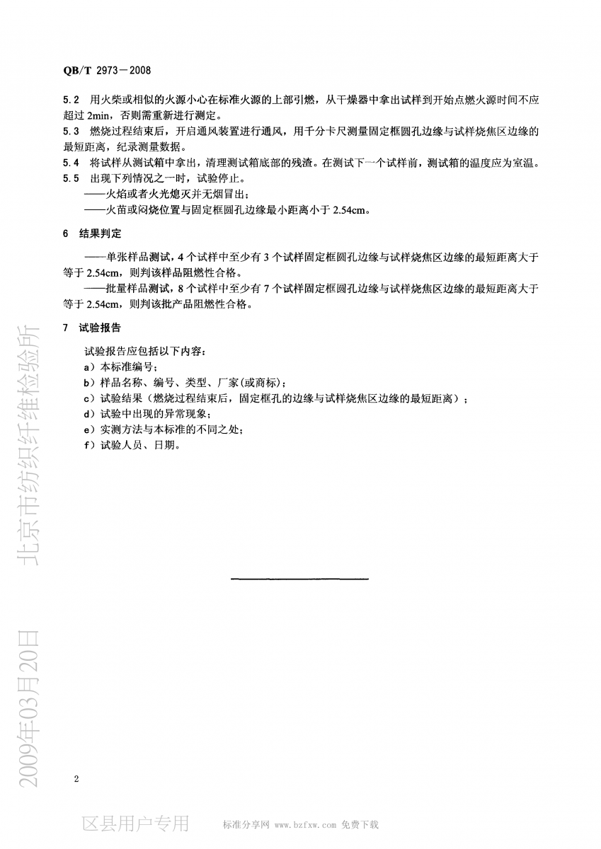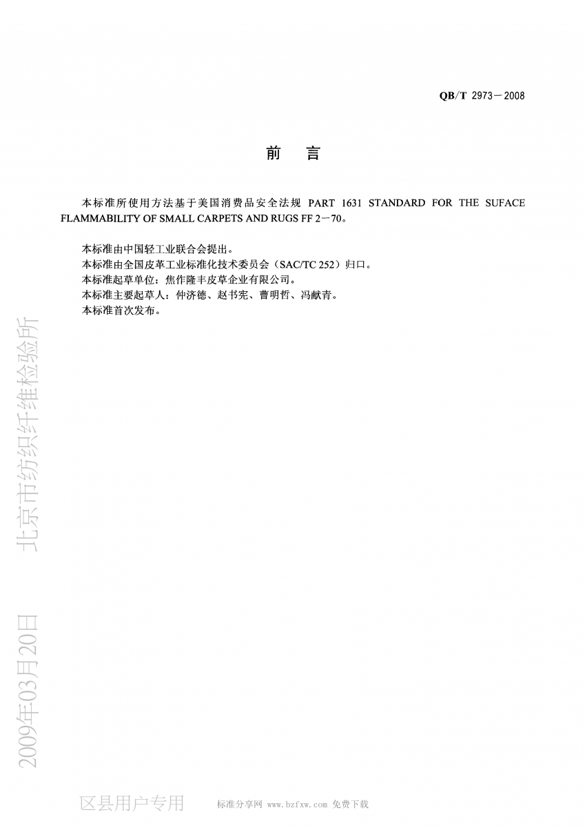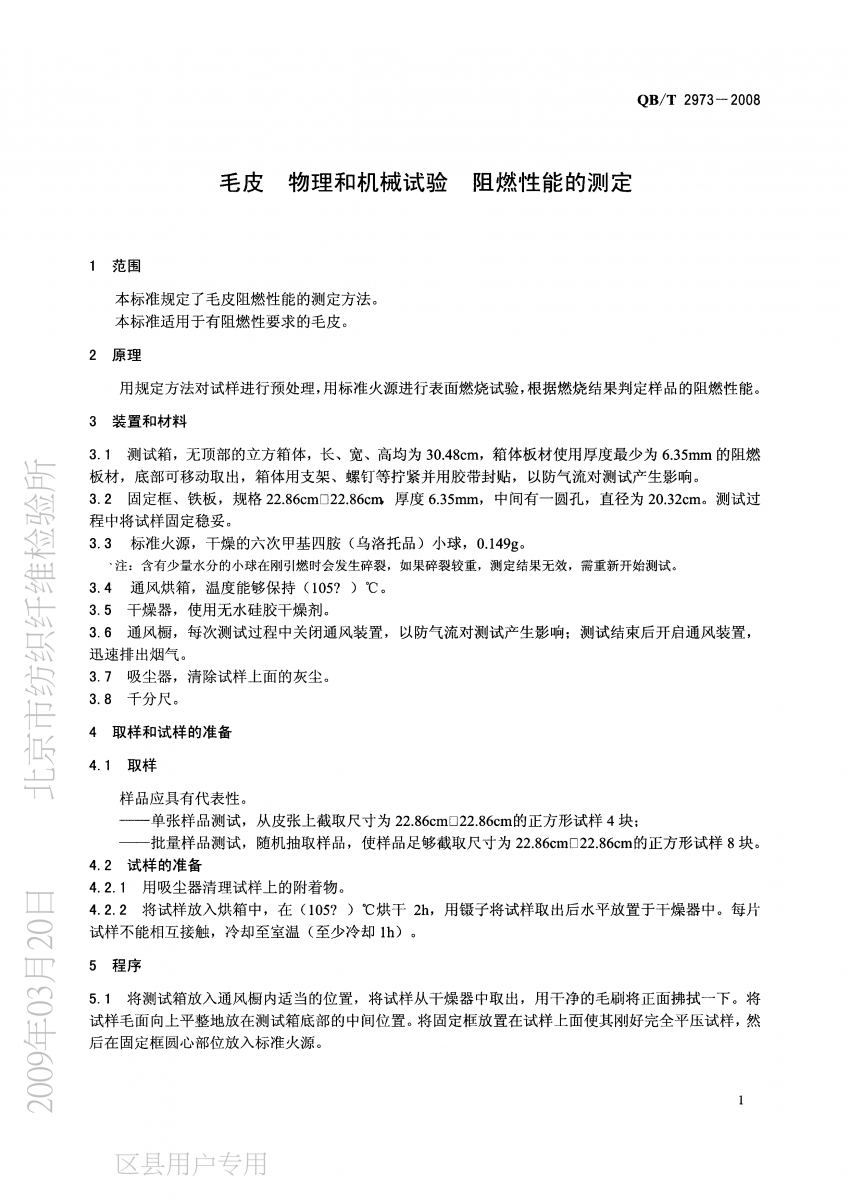 QB/T 2973-2008 毛皮 物理和机械试验 阻燃性能的测定