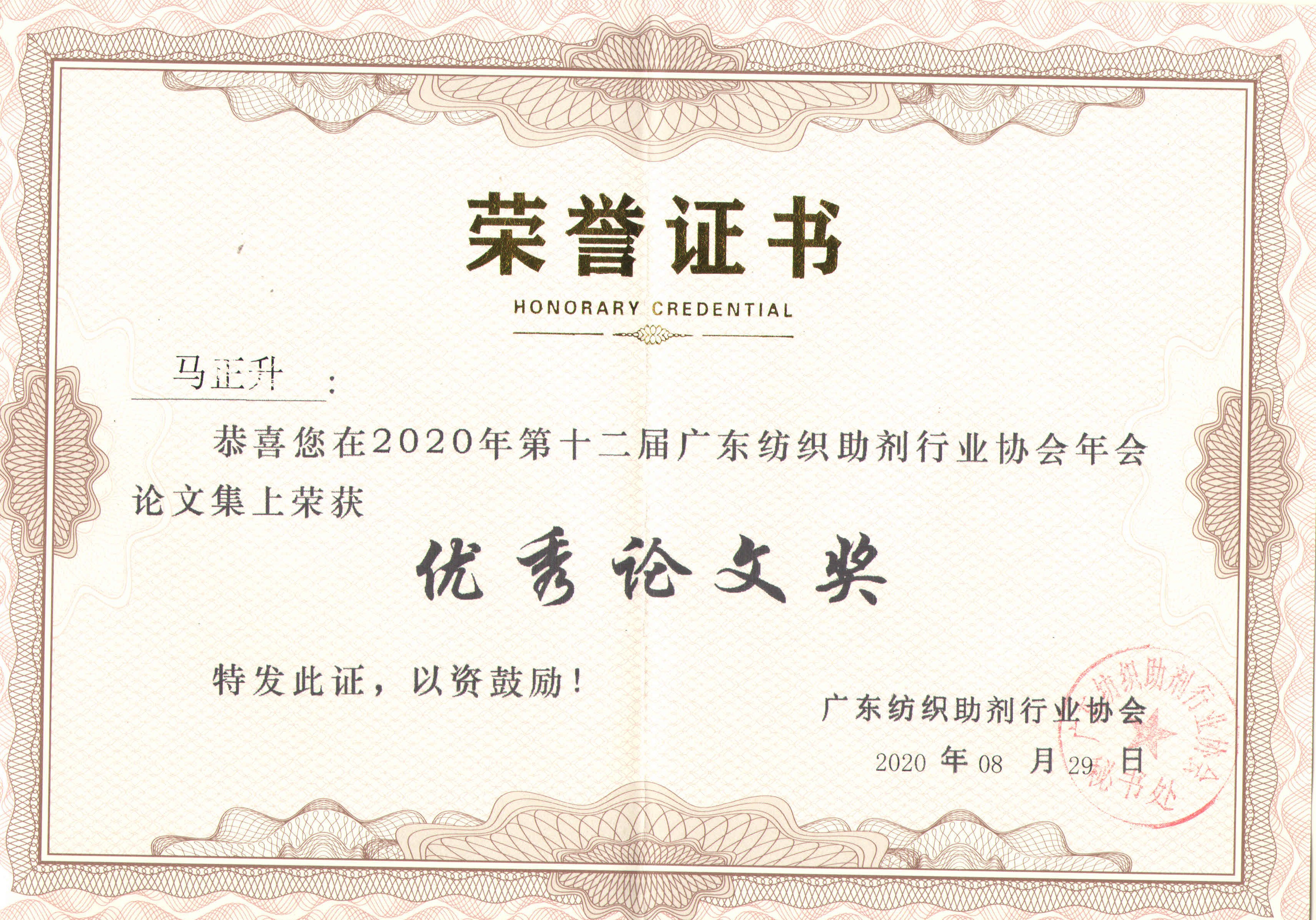 2020年第十二届广东纺织助剂行业协会优秀论文奖