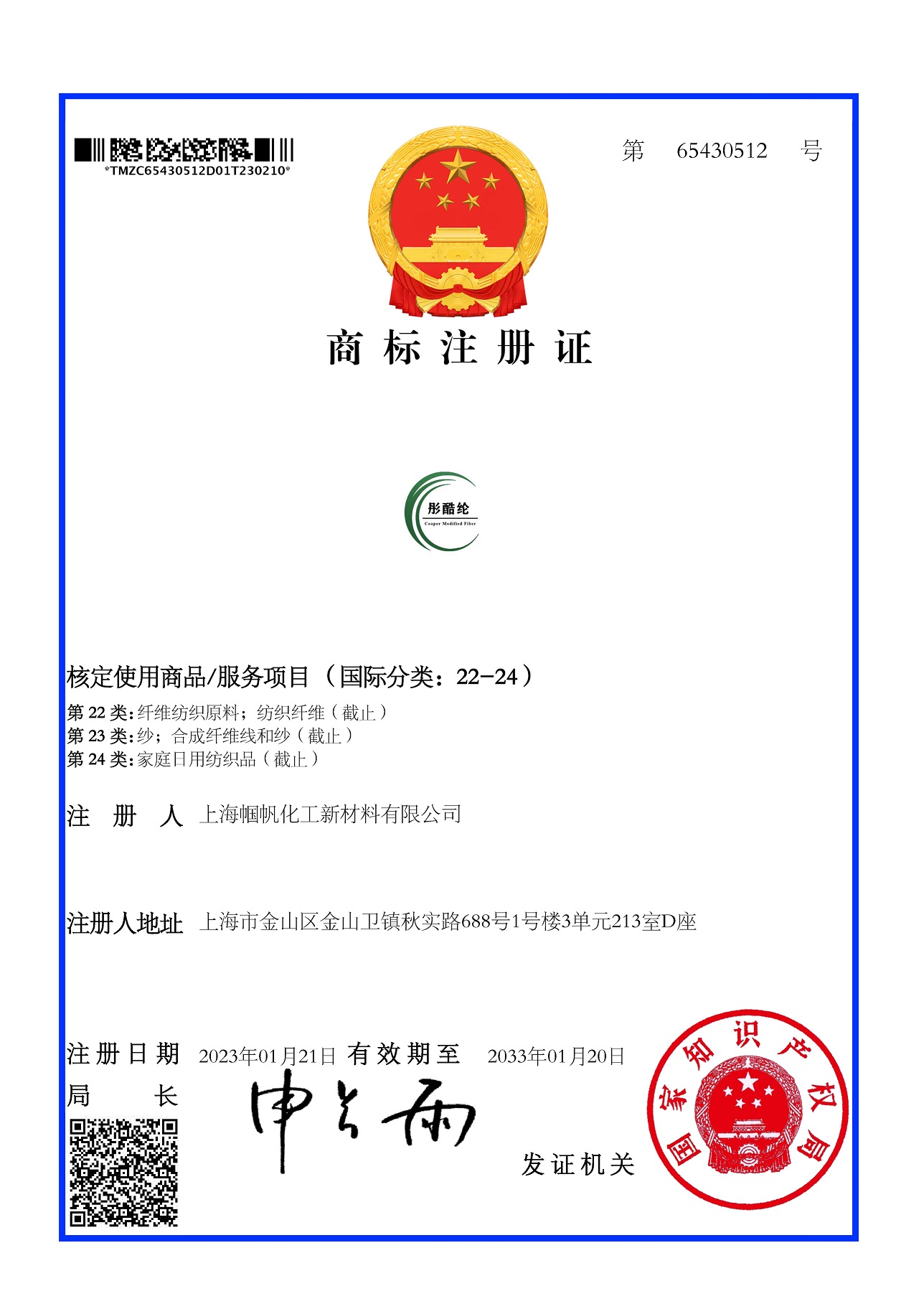 2022中国纤维流行趋势“有机高分子抑菌涤纶母?!坝胖使┯ι?铜牌