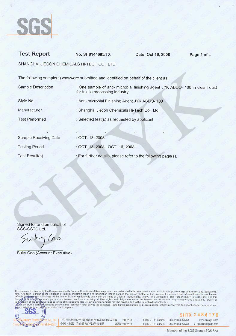 Safety and environmental test report - Antibacterial agent JYK ABDO-100- SGS
