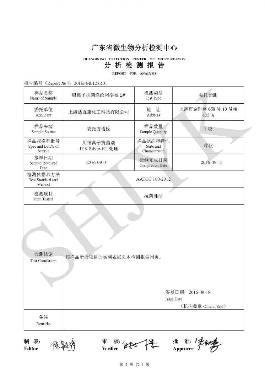 Antibacterial properties of silver ion mesh cloth --Gmicro Testing
