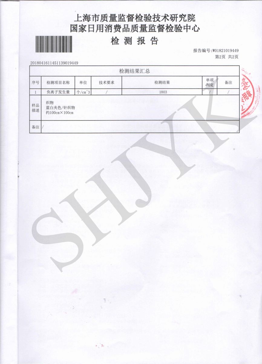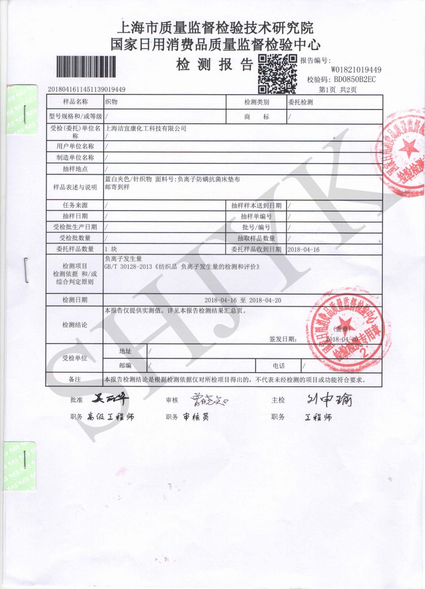 Negative Ion Test - Bedding Cloth (Knitted fabric)--Shanghai Quality Supervision and Inspection Center