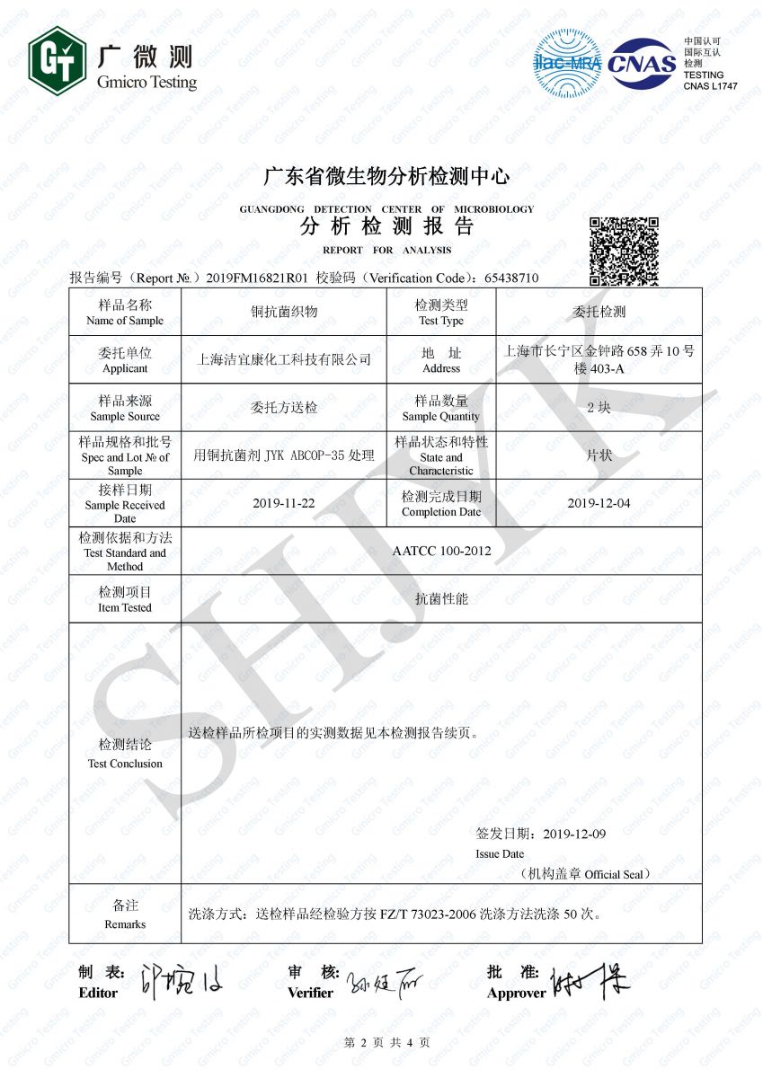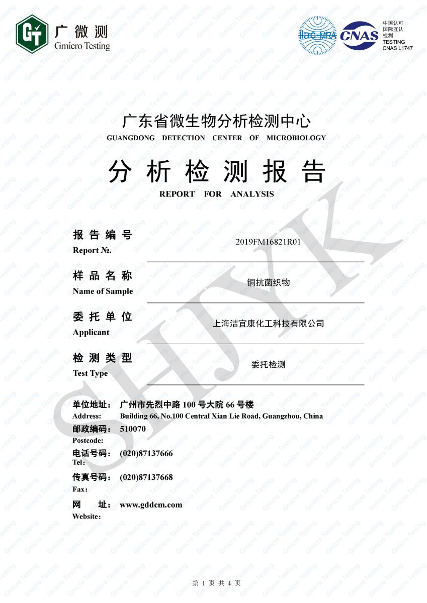 Copper antibacterial fabric - US standard (washed 50 times)- Gmicro Testing