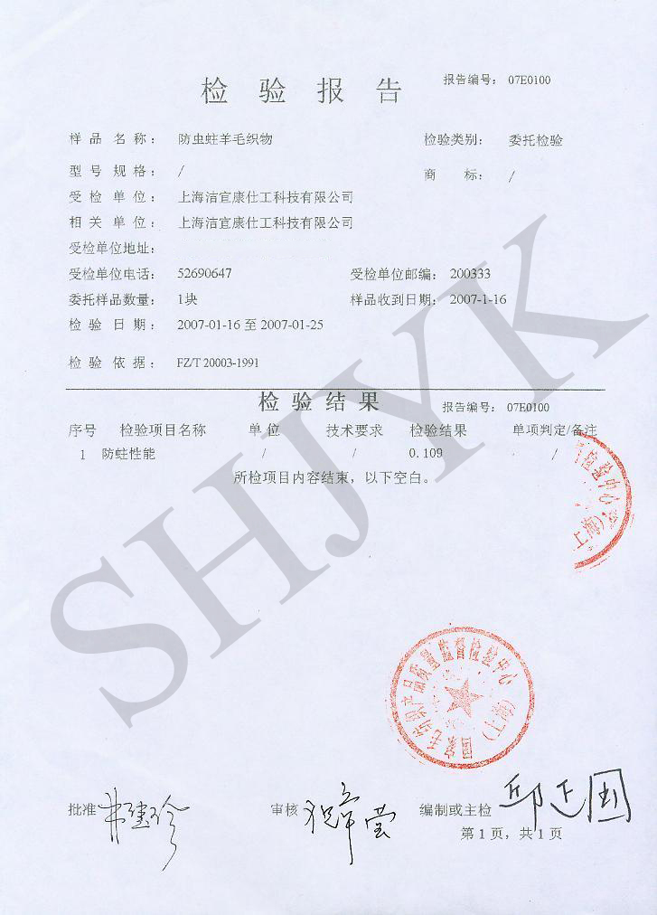 羊毛防虫蛀测试报告--国家毛纺质监检验中心