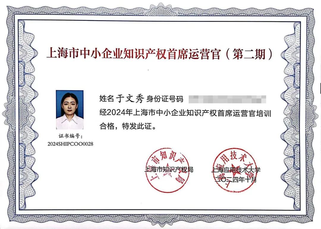 公司总经理马正升、公司综合办副主任于文秀、以及公司新生力量胡一凡取得上海市知识产权工作者证书,其中公司综合办主任于文秀更是成功通过2024年上海市中小企业知识产权首席运营官培训项目,正式获得“2024年上海市中小企业知识产权首席运营官”资格认证。这一成绩不仅标志着洁宜康在知识产权管理和?;ち煊蚵醭隽思崾档囊徊?,也彰显了洁宜康在人才培养、储备与技术创新方面的不懈努力和卓越实力。