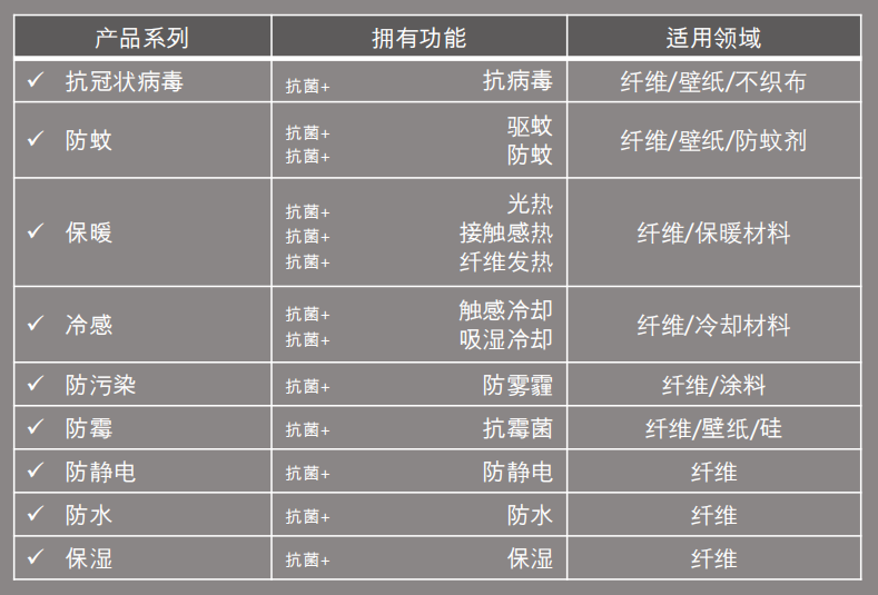 适用于多种纤维(天然纤维、合成纤维),可广泛应用于开发各种抗菌纺织品,包括口罩、窗帘、床单、内衣、衬衫、T恤衫、运动衣、手套、袜子、毛巾、浴巾、毛毯、被套、枕套、一次性医用纺织品等。