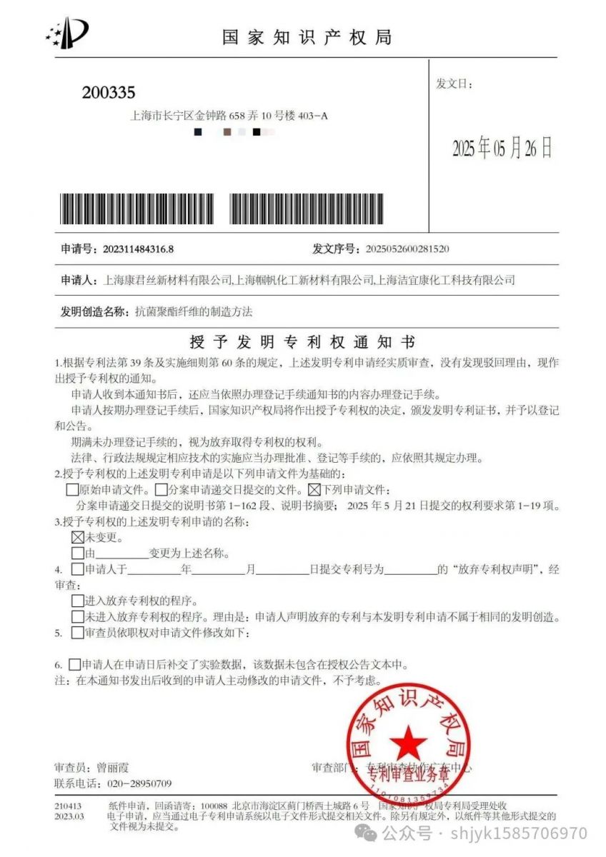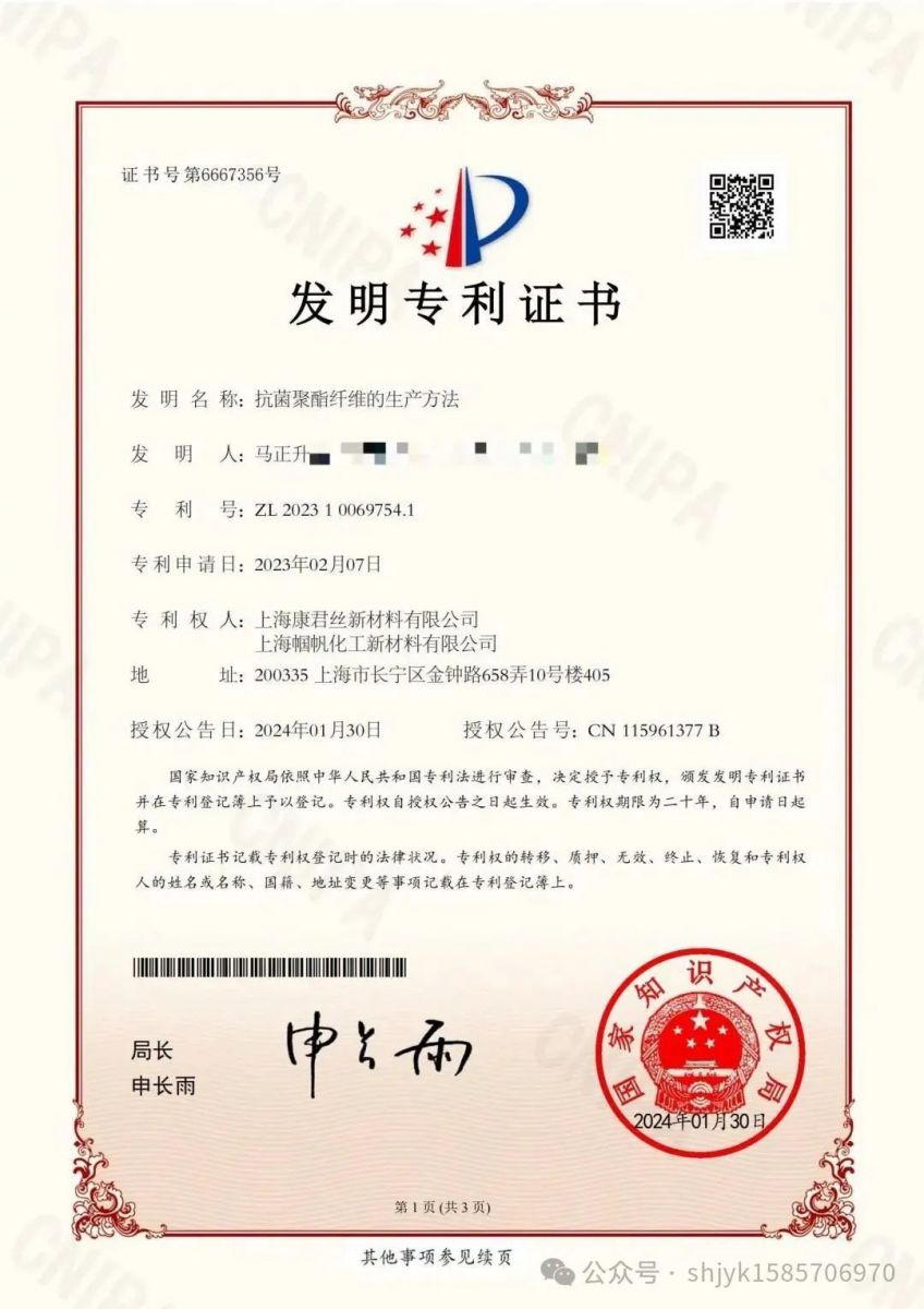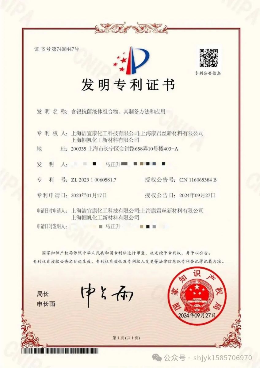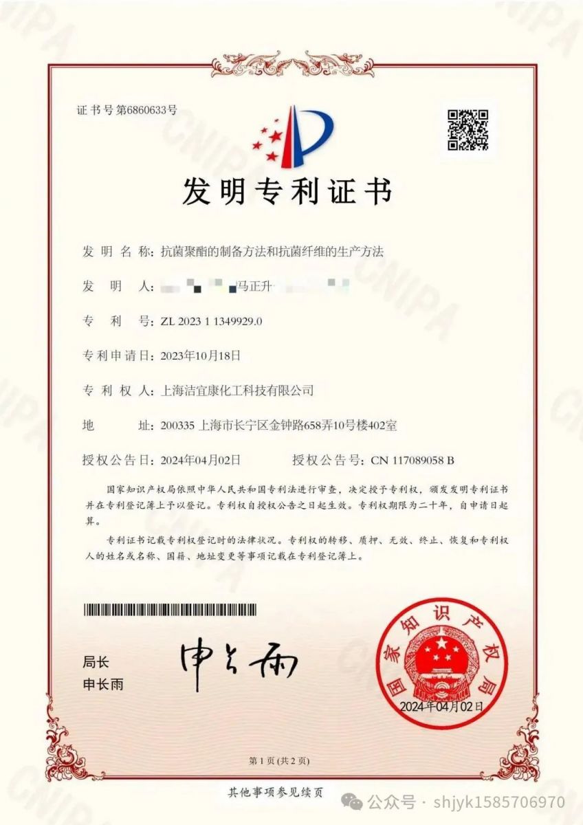 早在大众抗菌健康意识觉醒之前,上海洁宜康化工科技有限公司创始人以精准独到的眼光和巨大的魄力,早早便扎根于国产抗菌产品的研发和生产,深耕抗菌材料领域二十余年,以6项国家专利技术为基石,填补国内空白,为纺织、医疗、家居等行业提供高效、安全、持久的抗菌解决方案,用科技力量筑起健康防线。
