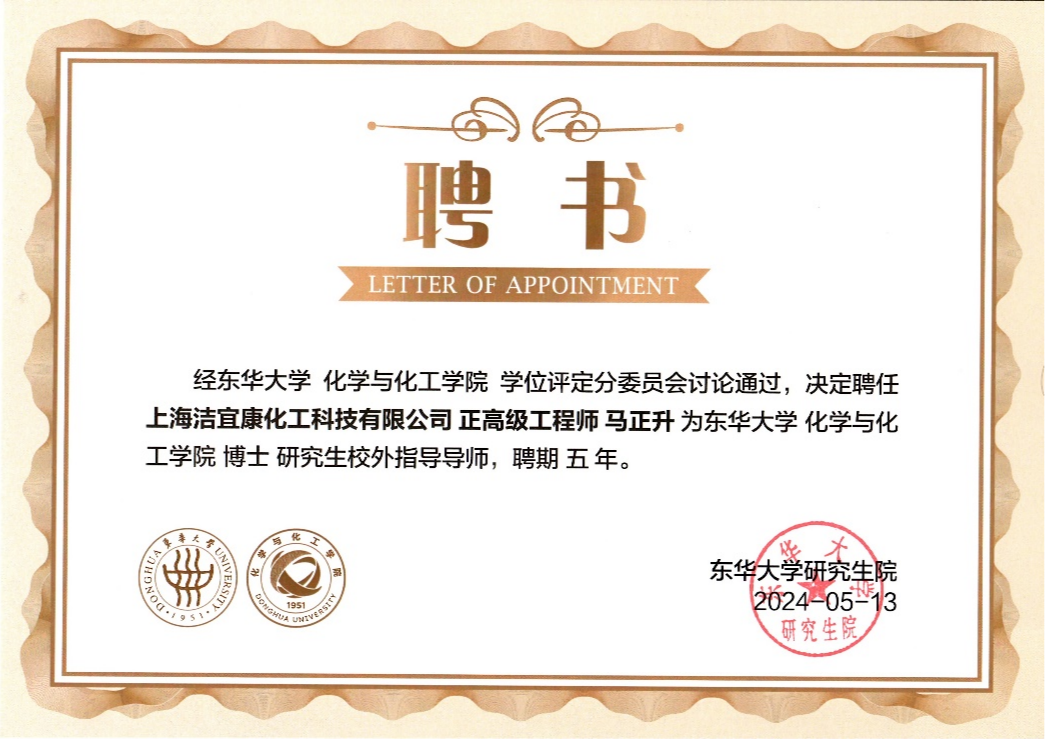 After discussion and approval by the Degree Evaluation Sub-Committee of College  of Chemistry and Chemical Engineering of Donghua University, it is decided to appoint Ma Zhengsheng, senior engineer of Shanghai Jiecon Chemicals Hi-tech Co., Ltd. as the external supervisor of doctoral students in College of Chemistry and Chemical Engineering of Donghua University. The appointment period is five years: