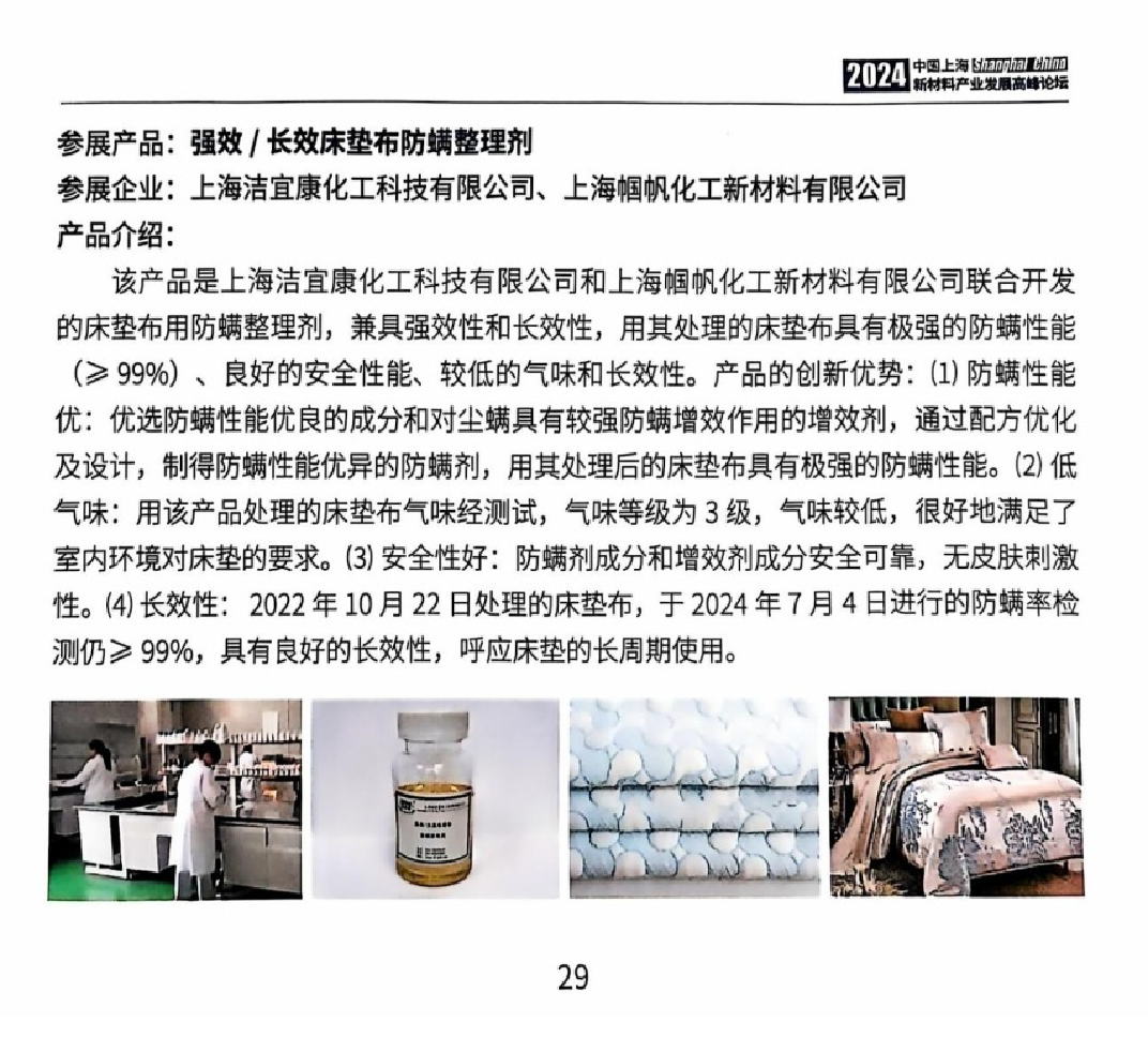 This product is an anti-mite finishing agent for bedding cloth with both strong and long-term performance. The bedding cloth treated with it has strong anti-mite performance (≥99%), good safety performance, low odor and long-term performance. In the process of product development, the core technology of the exhibit was simultaneously applied for an invention patent and was authorized. Compared with similar products at home and abroad, the product has excellent cost performance, and the core technology is in a leading position in China.