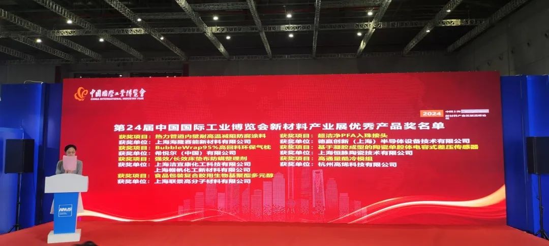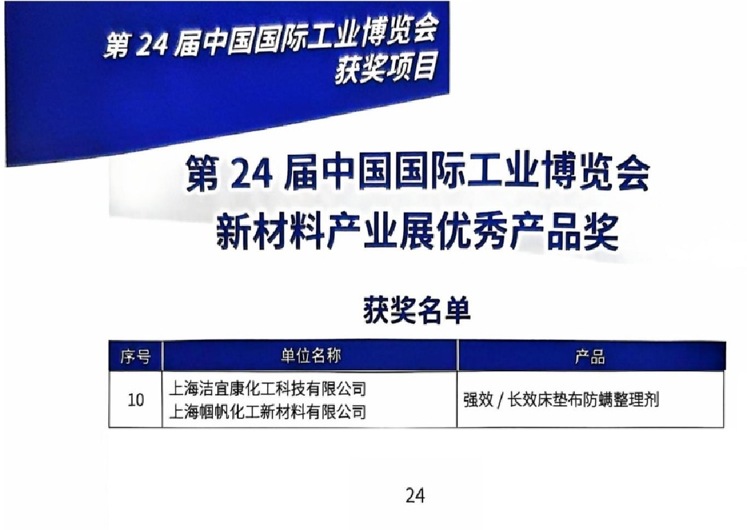 Shanghai Jiecon Chemicals Hi- Tech Co., LTD., with its outstanding achievements and unremitting innovation in the field of functional textile materials, was crowned with honor at the 24th China International Industry Expo, and won the "Excellent Product Award for New Materials"! This honor is not only the recognition of our product strength, but also the highest praise for the tireless pursuit and innovation spirit of the Jiecon team.