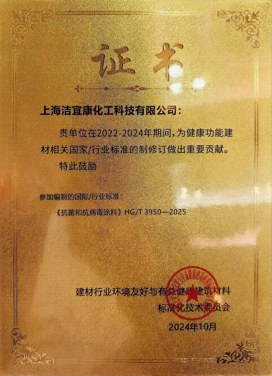 Shanghai Jiecon Chemicals Hi-Tech Co., LTD. (here in after referred to as "Jiecon") participated in and completed the preparation of the international/industry standard of "Antibacterial and Antiviral Coatings" HG/T3950-2025, which marks the further development of Jieyikang's technology development and standardization construction.