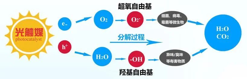 Photocatalyst (photocatalyst) technology has been widely used in the civil field in Japan and other developed countries and regions. After absorbing the ultraviolet rays of sunlight or lighting sources, its active components are oxidized and reduced to produce hydroxyl free radicals and superoxygen free radicals, which can react with organic matter, cut off the molecular binding of organic matter (C-C, C-H, C-N, C=O, N-H, etc.), and decompose the harmful substances and microorganisms in the air into harmless carbon dioxide and water. The working mechanism is shown in the figure below: