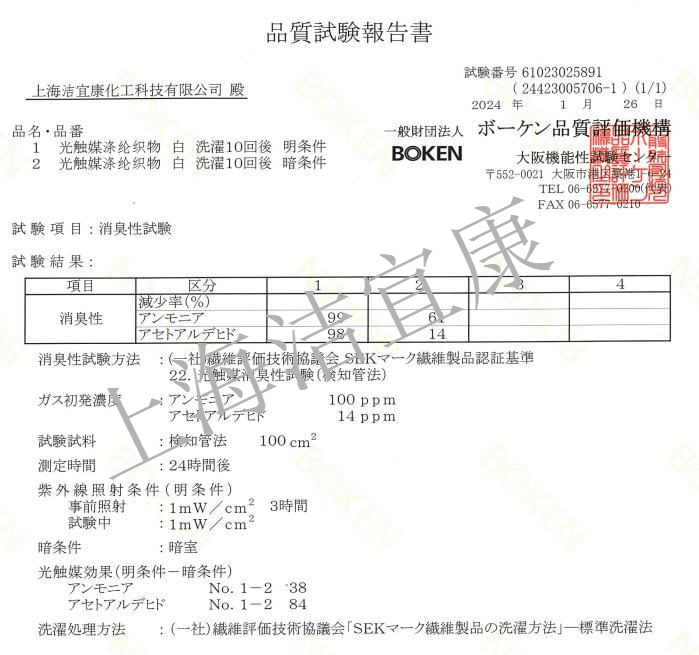 According to the daily standard: (I) SEK MARK fiber products certification standard 22. Photocatalyst deodorization test (detection tube method) (under ultraviolet conditions), the deodorization rate of ammonia and acetaldehyde under bright conditions was 99% and 98%; The photocatalytic effect of ammonia was 38%, and that of acetaldehyde was 84%. The test results show that the fabric treated with the photocatalytic finishing agent developed by our company has obvious photocatalytic activity, can produce good deodorization effect, and has good washing resistance.