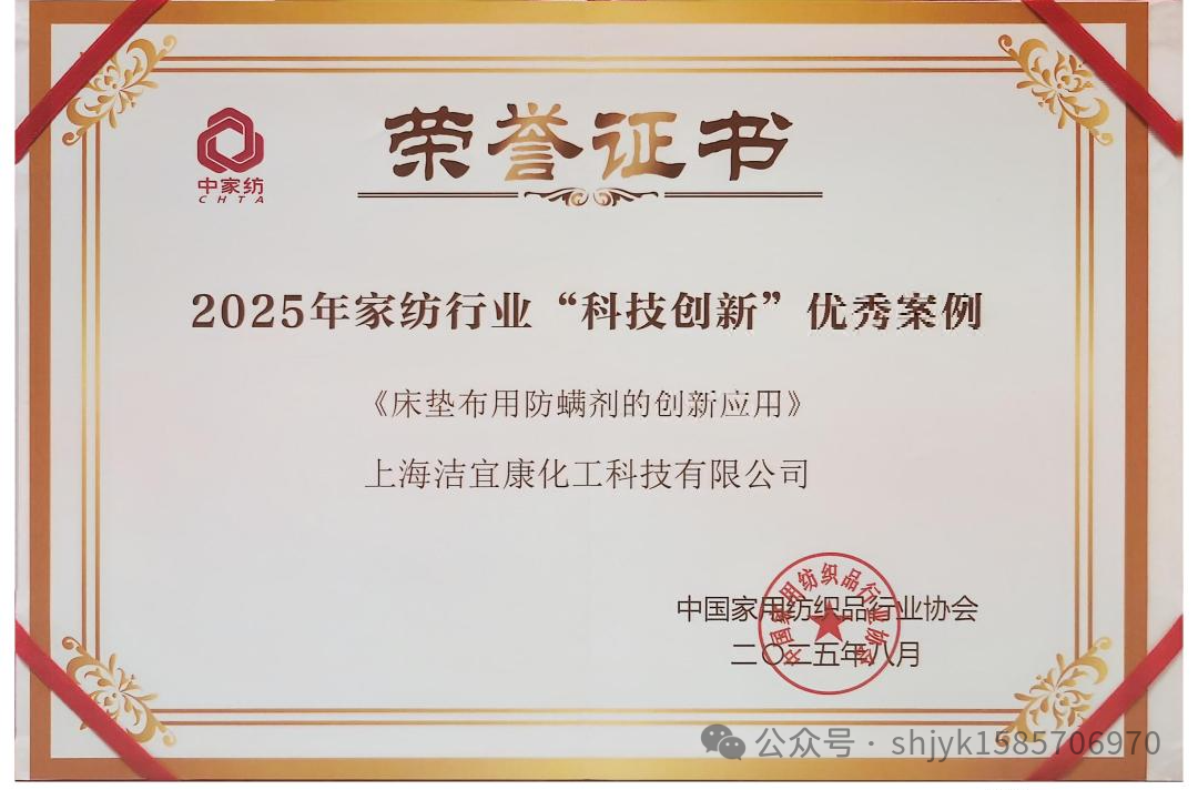 Recently, Shanghai Jiecon Chemicals Hi-Tech Co., Ltd. was awarded the title of "Outstanding Case of Technological Innovation in the Home Textile Industry" for the project "Innovative Application of Anti-Mite Agent for Mattress Fabrics" in 2025. This honor is a high recognition of the company's continuous innovation in the field of home textile hygiene and health,keep moving forward and achieve excellent results.