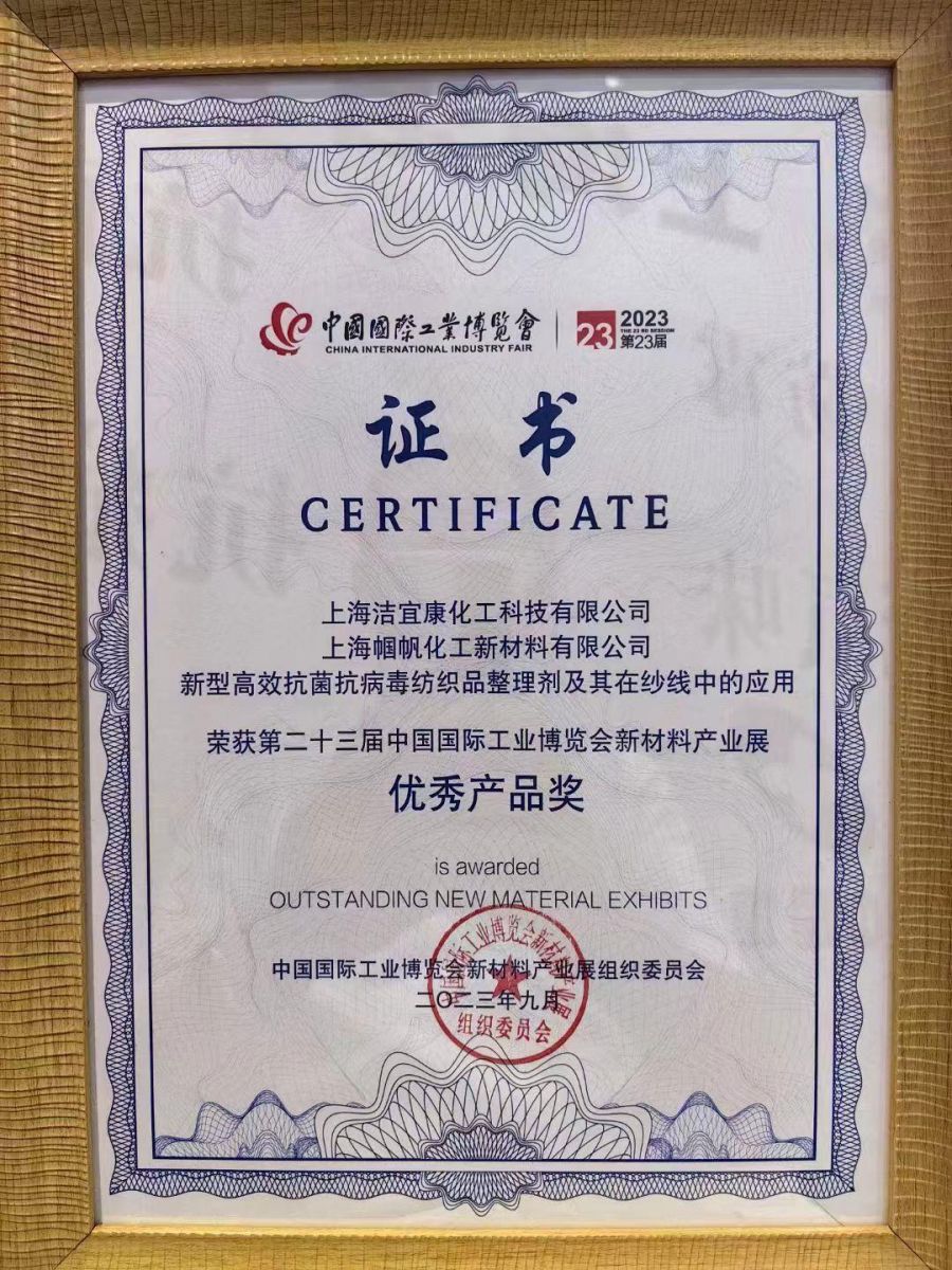Shanghai Jiecon/Guofan Chemical New -material Co., LTD. 's "New and highly Effective Antibacterial and Antiviral Textile finishing Agent and its application in yarn" has been awarded the "Excellent Product Award" by the Evaluation Committee of the Organizing Committee of the New Material Industry Exhibition of China International Industry Expo for its excellent antibacterial and antiviral properties and good application.