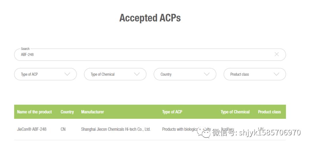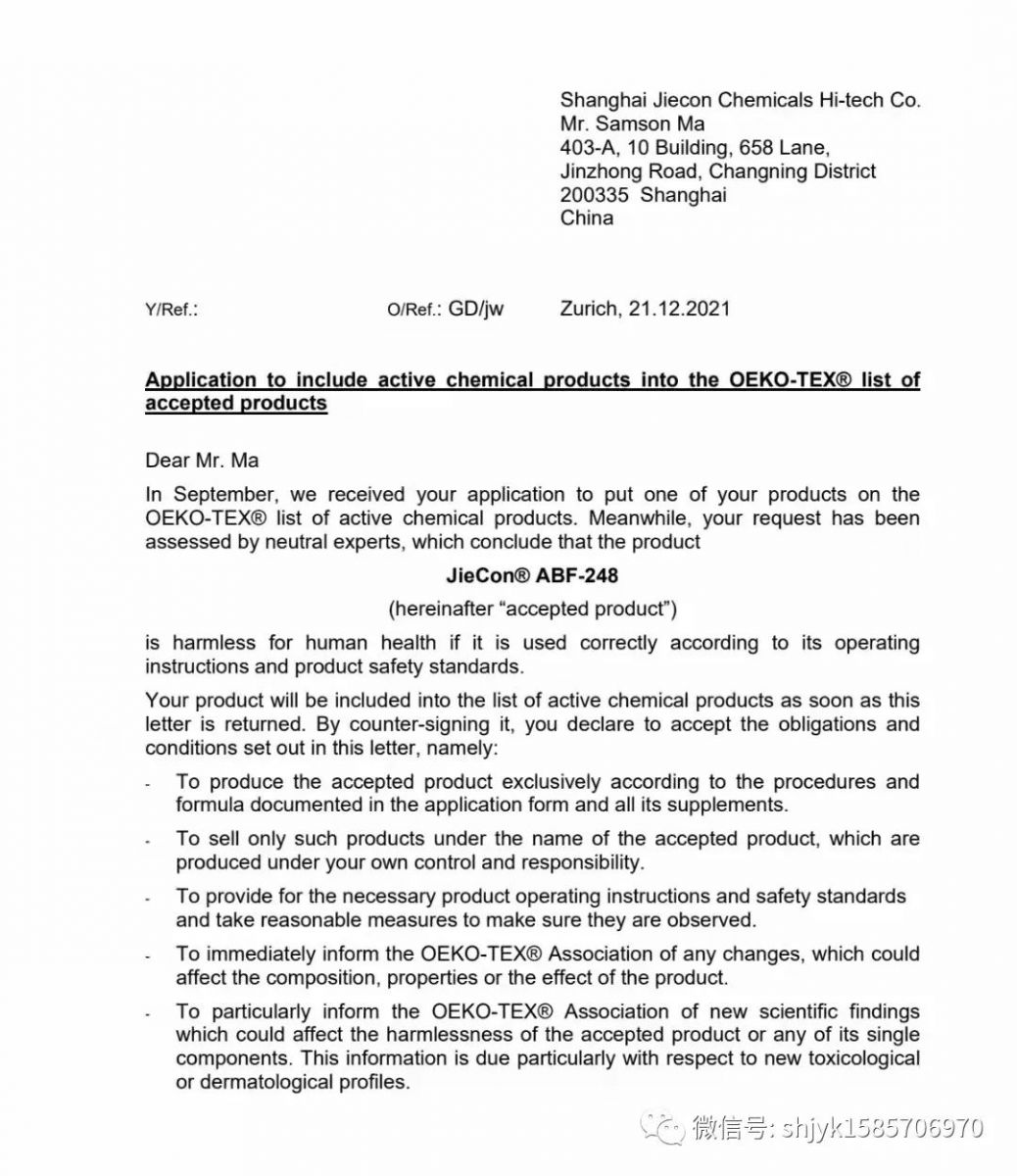 半年以上の申請ドッキング作業を経て、弊社の抗菌剤JYK abf-248は現在、OEKOTEX協会の「Accepted ACPs」に入っています?,F在、このリストの製品数は198件に過ぎません。上海潔宜康化工科技有限公司は今のところ比較的早くこのリストの国内会社に入ります。