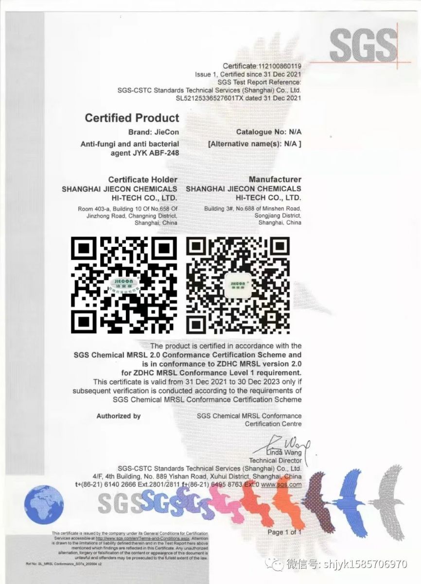 今年当社の二つの古典的な抗菌剤はZDHCの再審査を完了して、ZDHC 2.0の続証を取り扱って、引き続き業界をリードします:
