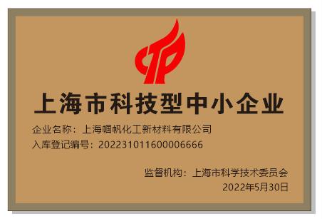 3、上海帼帆化学工業新材料有限公司は、上海市の科学技術型中小企業の第3陣として、2022年に入選され、入選番号は202231011600006666です。