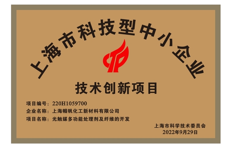 4、上海帼帆化学工業新材料有限公司のプロジェクト「光触媒多機能処理剤及び繊維の開発」は、2022年度上海市科学技術型中小企業技術革新資金の支援を受け、プロジェクト番号220H1059700となりました。