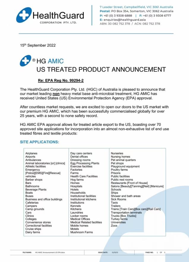 16、オーストラリアHealthGuard社の製品AMICを代理して米国EPA登録を獲得します。