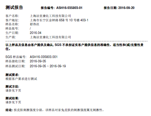 舒热丝®纤维具有良好的安全性,对皮肤无刺激性。SGS检测报告如下: